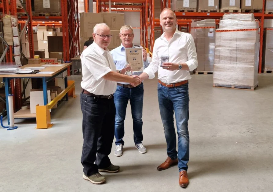 Evert van de Weg hands The Box CEO Tony Veer the company's award, while The Box office manager Ad Noordijk holds up the award certificate