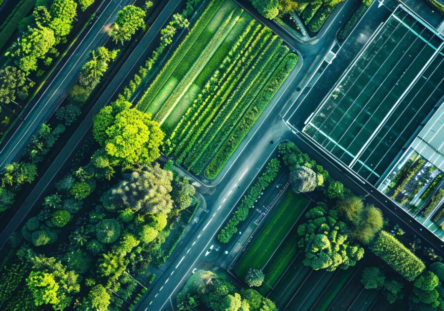 A drone aerial view of a green logistics hub, highlighting the integration of nature with logistics facilities for environmental sustainability