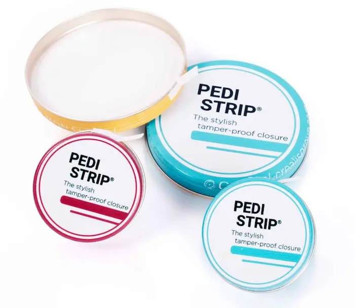 The components of the PediStrip include: a special aluminium alloy resistant to oxidation, excellent support for lithographic decorations, premarked rib and tear line of reduced strength to guarantee easy opening; a PVC-free virgin polyethylene foam disc liner, in compliance with the current international health and safety standards; and a tear-off strip made of non-woven fabric with a waterproof plastic matrix, which does not deteriorate when it comes into contact with liquids.