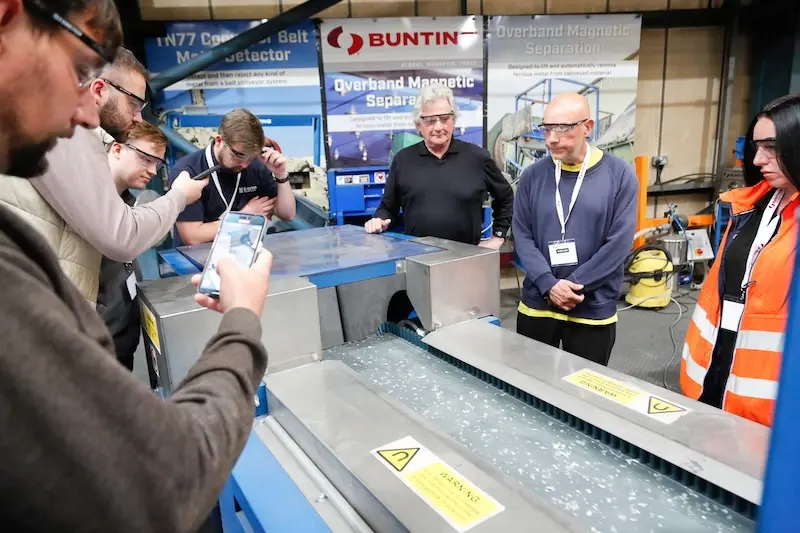 The tour then moved to the heavy recycling test area, with Bunting’s Phil Tree and Michael Allen staging separation demonstrations on the Eddy Current Separator, and the HISC and SSSC Stainless Steel Separators.
